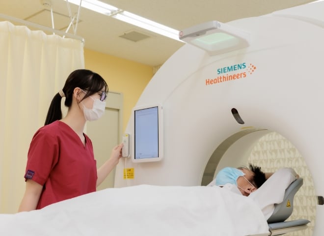 診療放射線科では画像診断装置を活用し、正確で迅速な画像を提供しています。一般撮影をはじめ,乳房撮影(マンモグラフィ)、CT、MRI、血管造影検査、心臓カテーテル検査など多岐にわたる検査を行っています。また、泌尿器科・婦人科造影検査やその他の透視撮影にも対応しており、各診療科と連携しながら医療を支えています。装置は常に最良の状態で使用できるよう定期的な点検・保守を実施し、トラブルの予防や検査精度の維持に努めています。安心して検査を受けていただけるよう安全管理と被ばく低減を徹底し、検査時には優しく丁寧な対応を心がけています。皆様の健康を守るため信頼される放射線画像を提供してまいります。