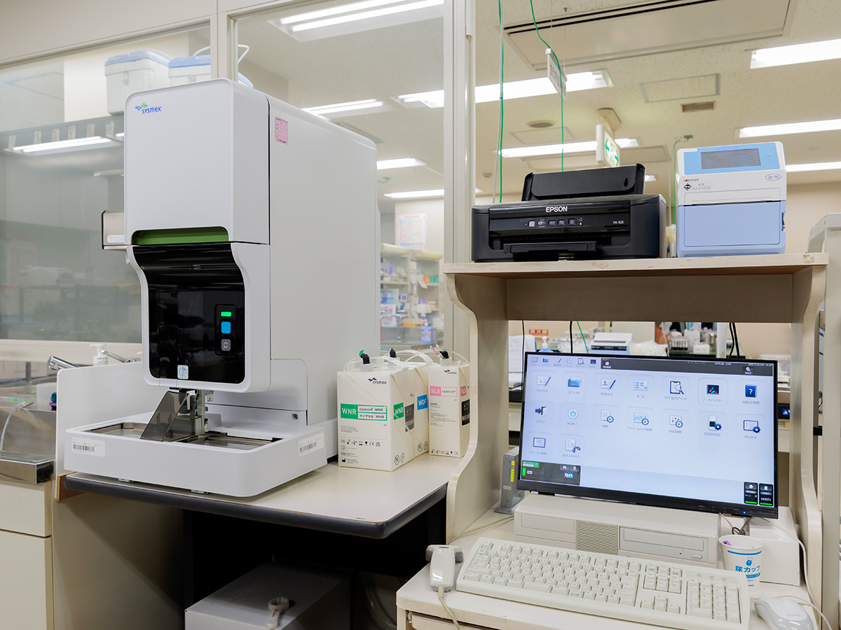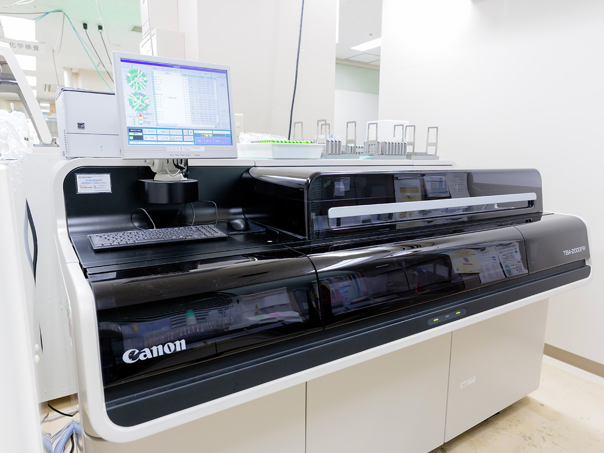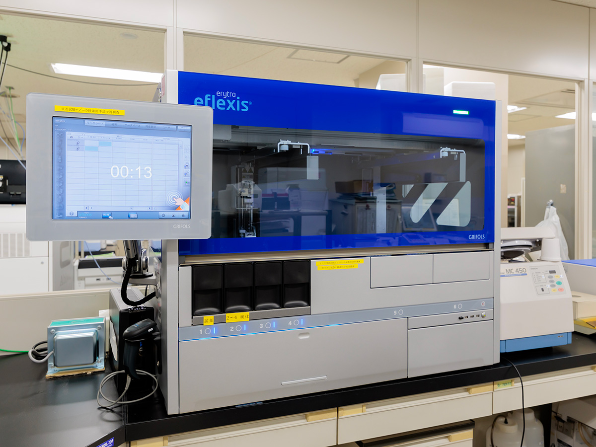 血液検査では赤血球や白血球、血小板などの数を測定し,顕微鏡下で白血病などの血液疾患の有無を調べます。輸血検査では安心安全な輸血療法を提供するために全自動輸血検査装置を導入し検査を行っています。入院時に血液型検査を実施し、重度の貧血が見られる場合は医師の判断のもと交差適合試験を行い、輸血の安全性を確認します。