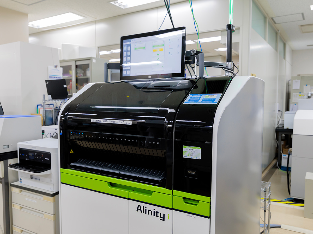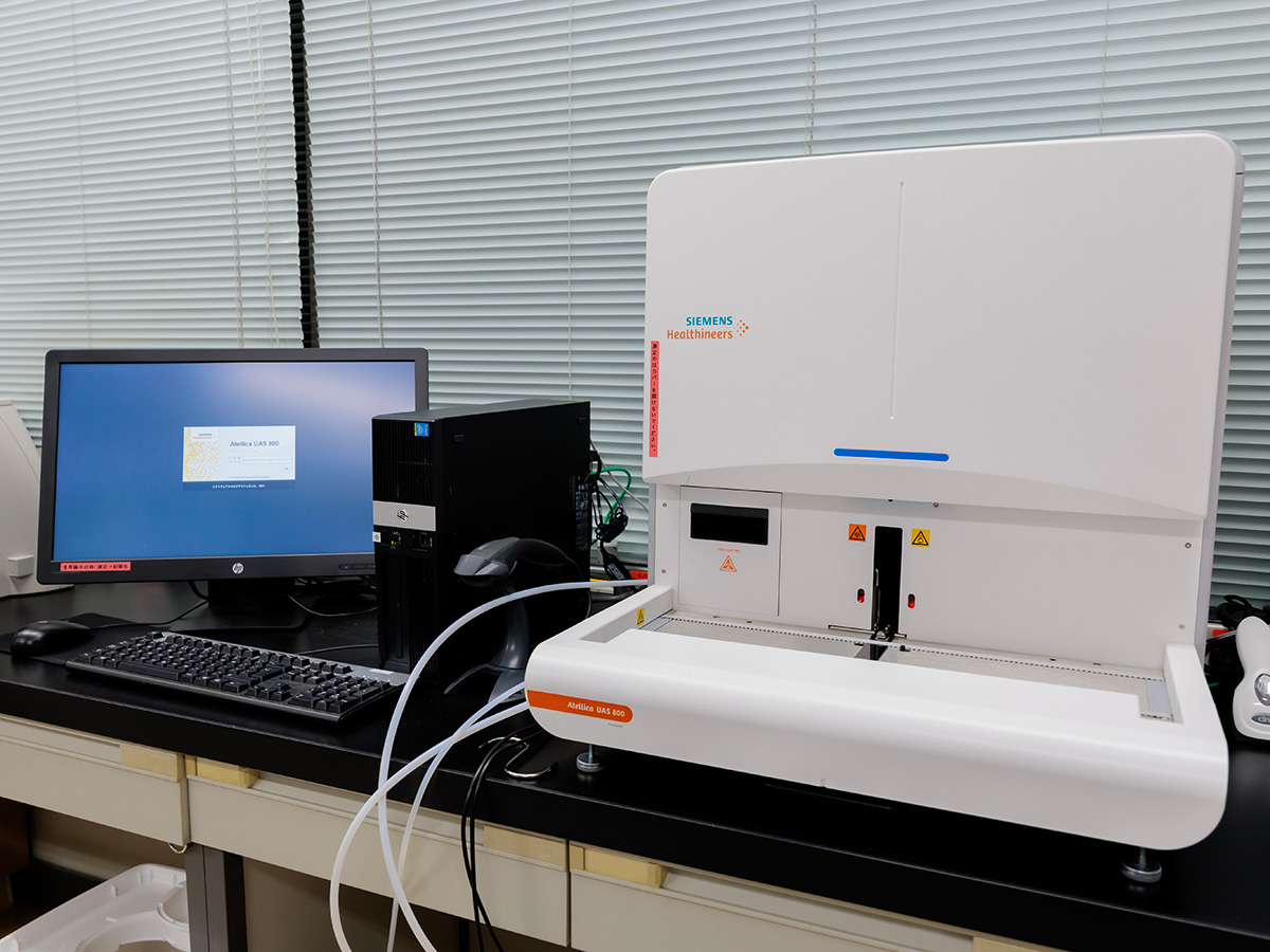 検体検査には生化学、免疫血清・輸血管理、血液・輸血検査、一般、外注の部署があり、病院および健康医学センターで採取された血液や尿などの検体を分析しています。検体検査では生化学分析装置や多項目自動血球分析装置、尿分取装置、全自動尿分析装置、尿中有形成分分析装置などを用いて迅速な検査結果の報告に努めています。