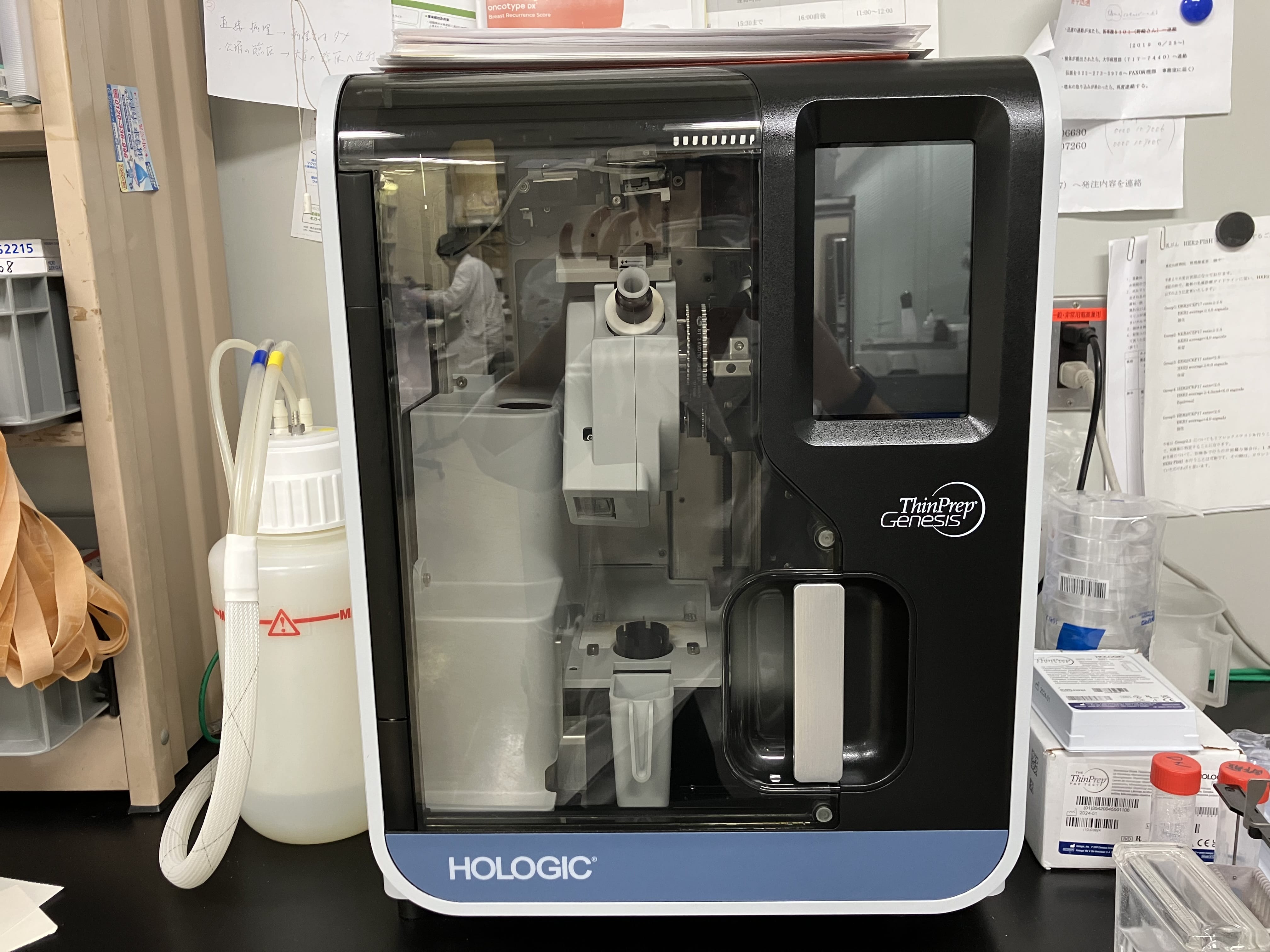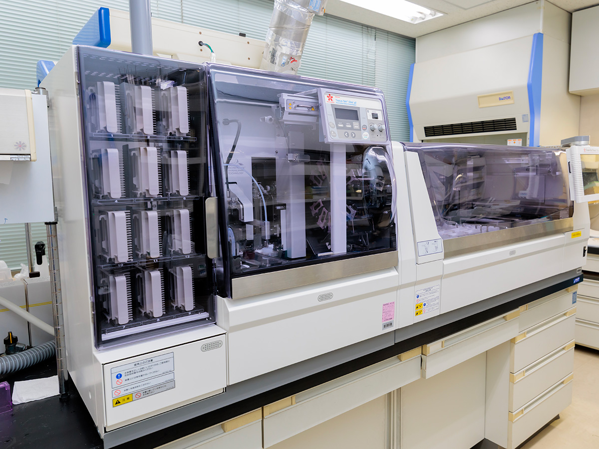 病理検査室での主な業務は病理組織標本作製、術中迅速診断時の標本作製、細胞診検査、免疫組織化学染色、遺伝子検査のための標本作製です。