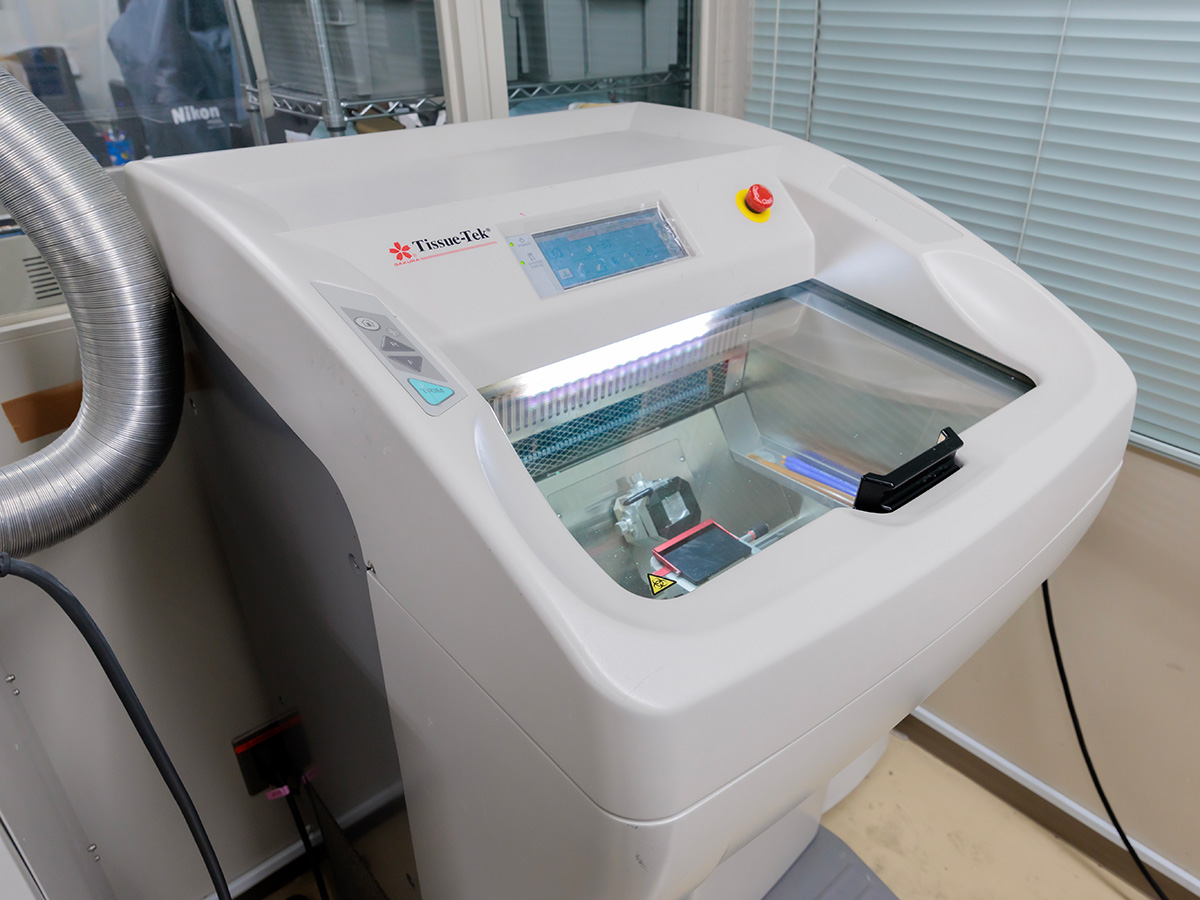 組織を急速に凍結させて凍結切片作製装置で標本を作製します。当院では主に乳腺のセンチネルリンパ節、甲状腺・副甲状腺の術中迅速診断を行っています。技師には短時間で良質な標本作製が求められます。