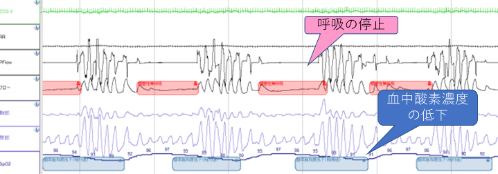 強く睡眠時無呼吸症が疑われる場合は、一泊入院で行う精密検査(終夜睡眠ポリソムノグラフィー)で、睡眠の深さと睡眠中の呼吸や脈拍、酸素濃度の変動などを更に詳しく調べます。
