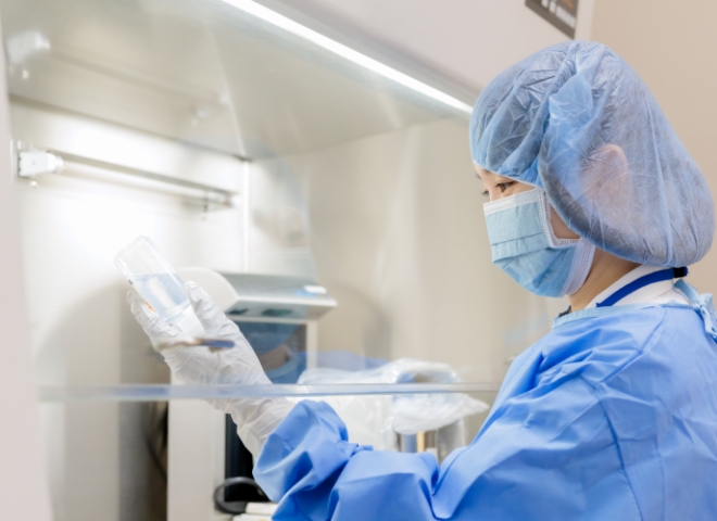 製剤室では 1.院内製剤 2.高カロリー輸液の無菌調製 3.抗がん剤の無菌調製の3つの業務を行っています。1.院内製剤は『院内製剤の調製及び使用に関する指針(Version 1.1)』に従って調製しています。調製業務は医療安全の目的から薬剤の取り揃え、調製量の計算、調製時の抜き取り量の確認、点滴ラベルの貼付に至るまで、複数の薬剤師が確認する体制を敷いています。高カロリー輸液の調製はクリーン・ベンチを用いて清潔かつ安全に調製しています。また外来および入院のがん化学療法においては、患者さんの体の大きさや臨床検査値、副作用の状況などから抗癌剤の投与量などが適正であるかを確認し、患者さんや調製者、その他投与に関わるすべての方の抗癌剤からの曝露対策を考慮しつつ、安全キャビネットにて調製を行っています。
