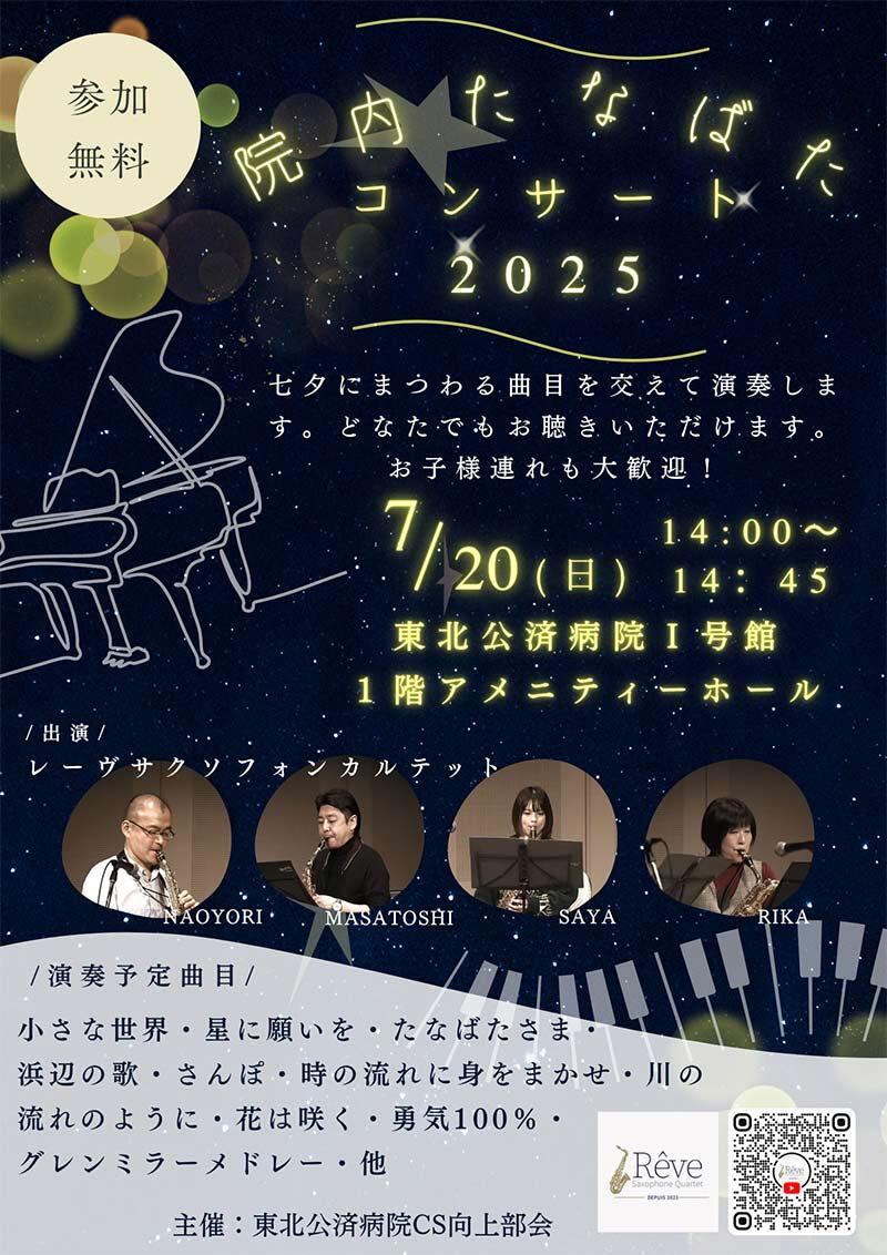 7月20日(日) 14時より、東北公済病院Ⅰ号館1階アメニティーホールにてレーヴサクソフォンカルテットによるコンサートを開催します。
