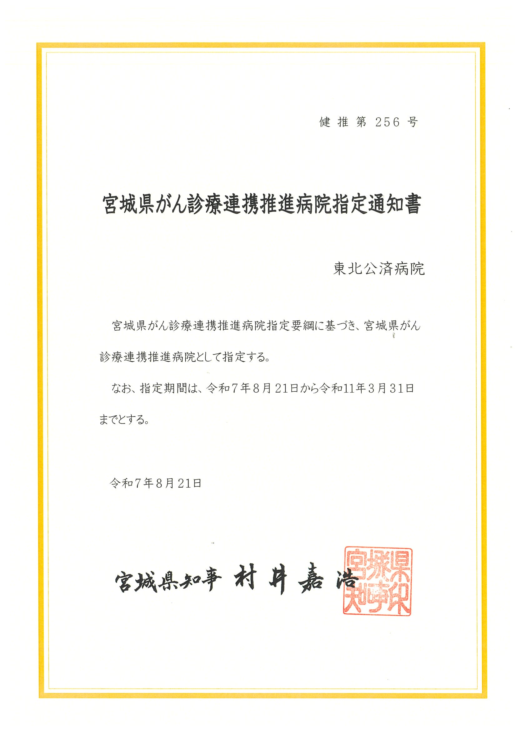 2025年09月04日患者さん 宮城県より「宮城県がん診療連携推進病院」の指定を受けました 県のがん医療の質を向上させるため、がん診療連携拠点病院と連携して診療を行う「宮城県がん診療連携推進病院」の指定を受けました。